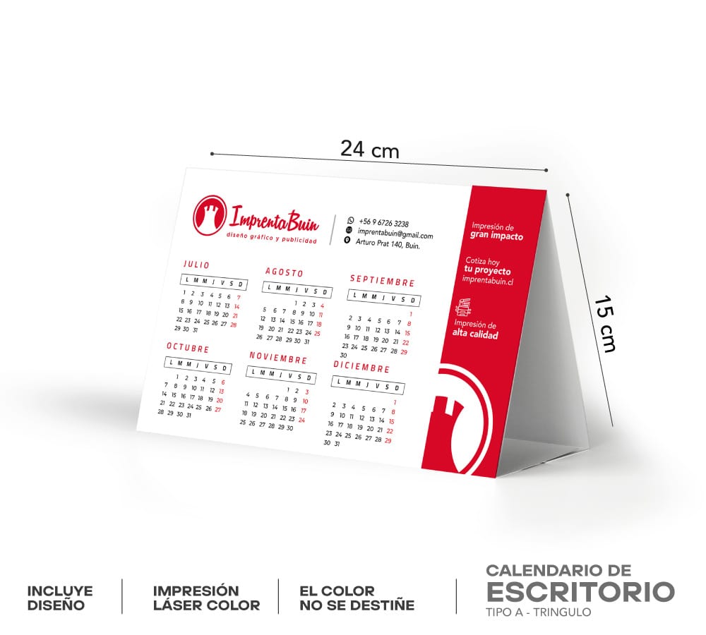 En Imprenta Buin imprimimos calendarios de escritorio personalizados tipo A ideales para regalar a clientes, fidelizar tu marca y mantener presencia durante todo el año. Utilizamos impresión láser digital de alta resolución con nuestra prensa Konica Minolta, logrando una calidad de color superior, acabados vibrantes y una presentación profesional.